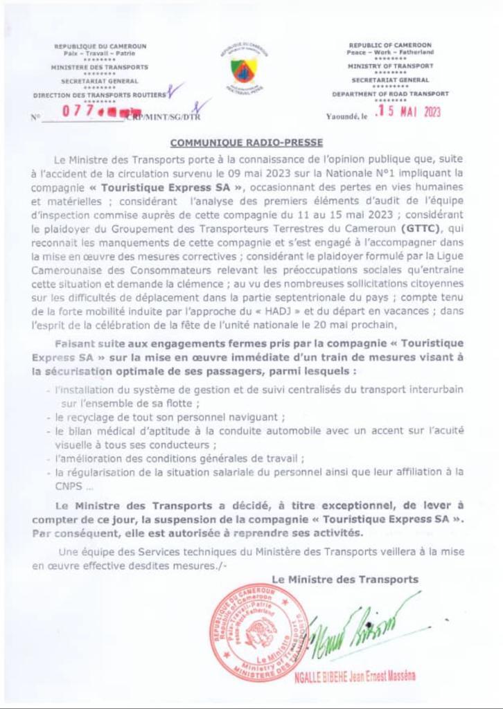 Le patron des Transports évoque les raisons pour lesquelles sa précédente note a été reconsidérée. Il s’agit tout d’abord du plaidoyer du Groupement des Transporteurs Terrestres du Cameroun (GTTC), reconnaissant « les manquements » de Touristique Express et qui prend l’engagement de « l’accompagner dans la mise en œuvre des mesures correctives ». Par ailleurs, Jean Ernest Masséna Ngallè Bibehe a également tenu compte du plaidoyer de la Ligue Camerounaise des Consommateurs et des plaintes venant des citoyens sur les difficultés de déplacement dans la partie septentrionale du pays. Il souligne également l’approche du Hadj, le départ en vacances et la fête nationale de l’unité en vue.