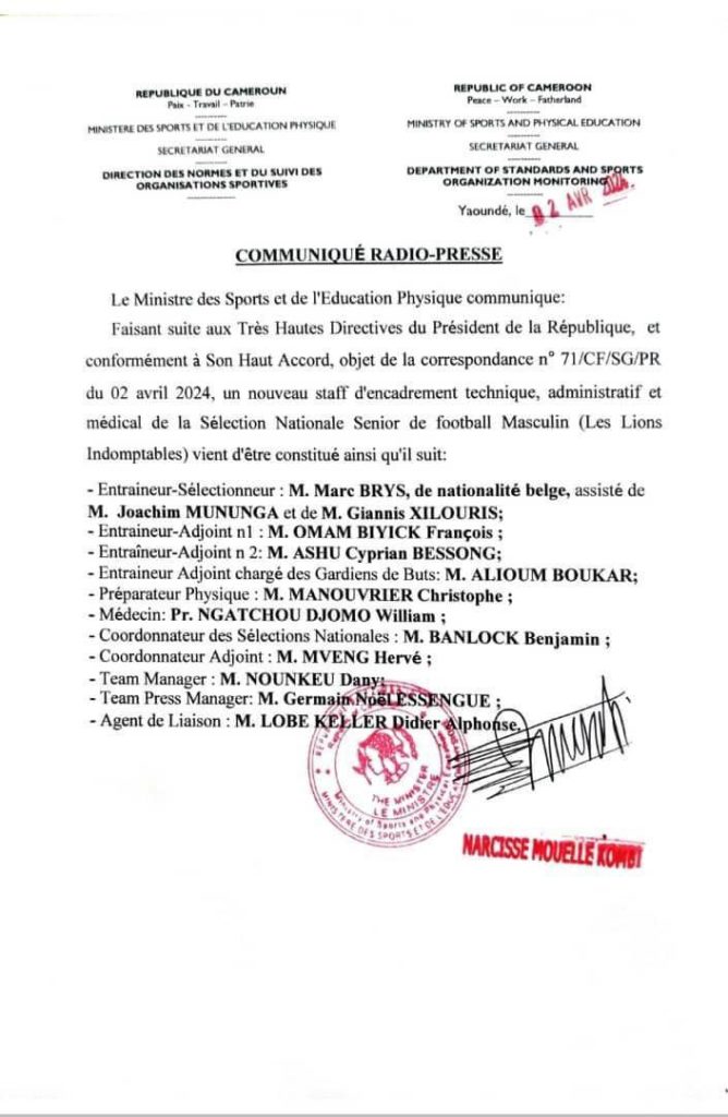 Yaoundé, 02 avril 2024 (CAPnews) – Cinq semaines après le limogeage de Rigobert Song, les Lions indomptables ont enfin un nouveau sélectionneur. Il est Belge et Flamand. Il s’appelle Marc Brys. Contrairement à la tradition, sa nomination a été officiellement annoncée par le ministère des Sports et non par la Fédération Camerounaise de Football (FECAFOOT). Il est le troisième Belge, après feu Henri Depireux de 1996 à 1997 et Hugo Bross de 2016 à 2017, à prendre les rênes de l’équipe nationale de football du Cameroun.